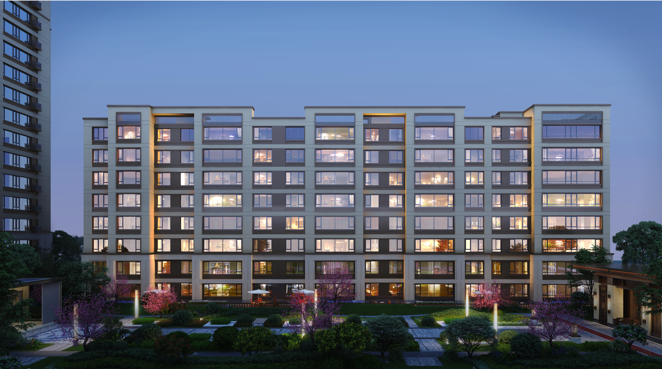 项目规模:占地44.76亩,规划5栋商品住宅(2栋高层,1栋小高,2栋洋房)及1栋邻里中心,共计382户,864个停车位